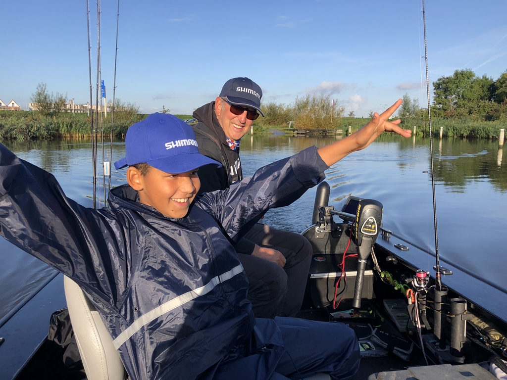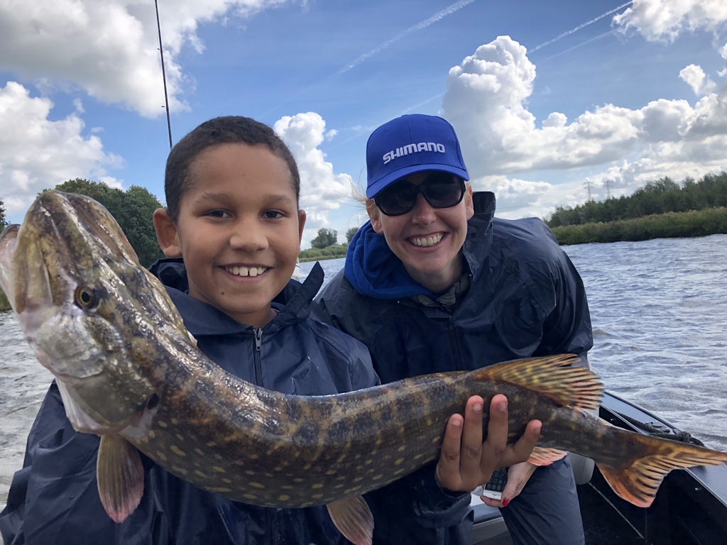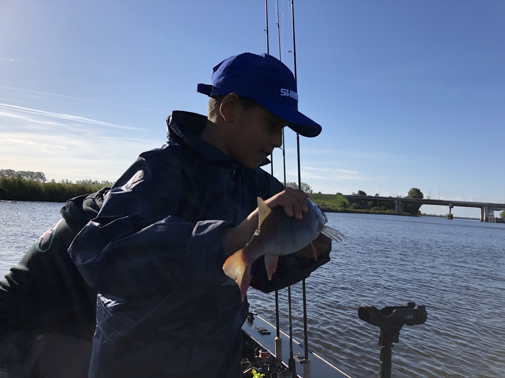Mark vangt zijn eerste snoek, de kieuwgreep gaat ook goed. Hij heeft nu al drie soorten gevangen, de dag kan al niet meer stuk. Als we door de stad richting de snackbar varen roept hij iedereen toe wat hij allemaal gevangen heeft.