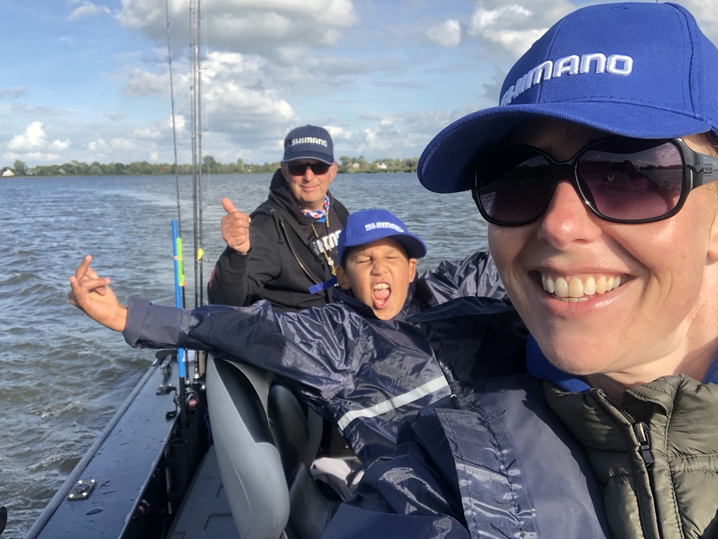 Mark kruipt op schoot bij Martine en ik zie hem lekker genieten. Plotseling duikt hij naar voren naar zijn hengel en voor ik het weet staat hij te drillen. De hengel staat goed krom, ik leg ondertussen de boot stil en draai de andere hengels in.