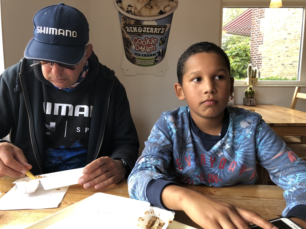 Tussen de middag eten we even een patatje en kunnen we even de benen strekken. Daarna trollen we nog een rondje door de stad en gaan we nog even werpen op baars. Hier en daar vangen we een visje maar wat ik veel belangrijker vind is dat deze jonge visser een mooie dag heeft.