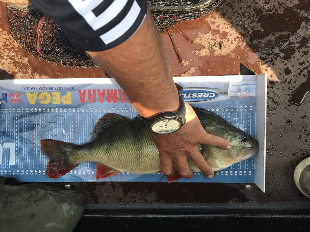 Hier beleven we een paar prachtige uurtjes. De ene na de andere baars knalt er op, we worden helemaal hyper. Waar we ook gaan liggen, het is bingo. Veertigplus vissen gaan zonder foto weer terug. Niet omdat we ze niet waarderen maar omdat de vangdrang steeds groter wordt. Dit is het, dit is vissen, wat een belevenis!