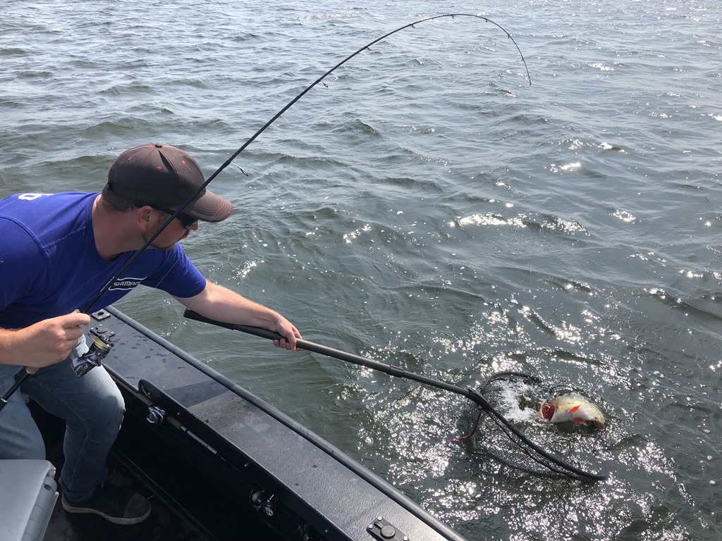 Een zeldzame foto van een baars tijdens de feeding frenzee. We worden arrogant en gooien zelfs 40’ers overboord zonder foto.