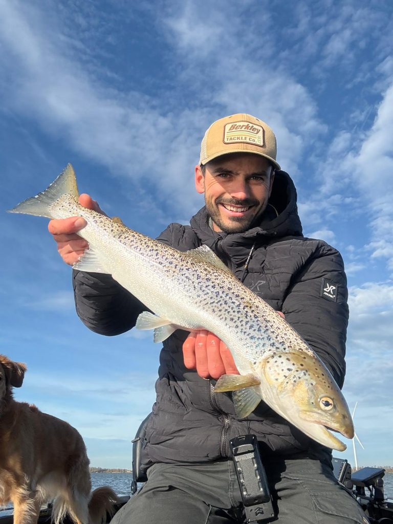 Simon wist een zeeforel te vangen tijdens het vissen op snoekbaars.