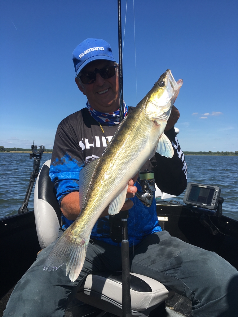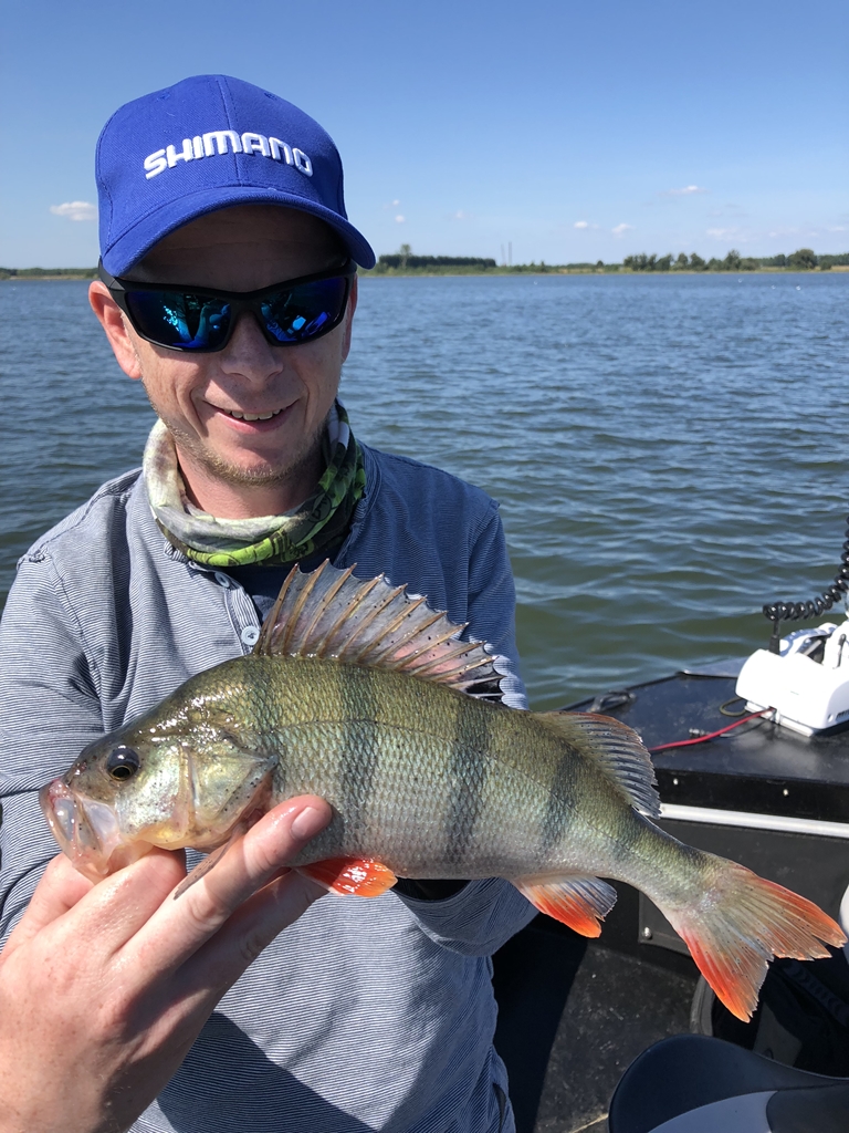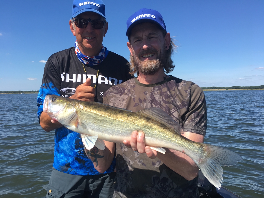 Het belooft stralend weer te worden, dertig graden met een licht zuidoosten windje. Geen top omstandigheden om te vissen, maar thuis vang je zeker niks. We beginnen op lagerwal waar de wind misschien nog wat zuurstof in het warme water brengt. Diverse stekken doen we verticalend en met de dropshot aan, maar dit levert geen vis op.