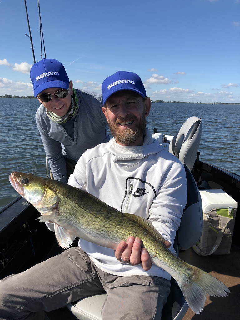 Dan is het zover, een harde tik op de dropshot van Gerard. Hij grist de Lesath uit de steun en trekt hem in een mooie curve. Hij vangt zijn eerste snoekbaars en meteen een mooie ook. Hij is helemaal enthousiast en blij, uit de schroeven zoals we dat in Fryslân noemen.