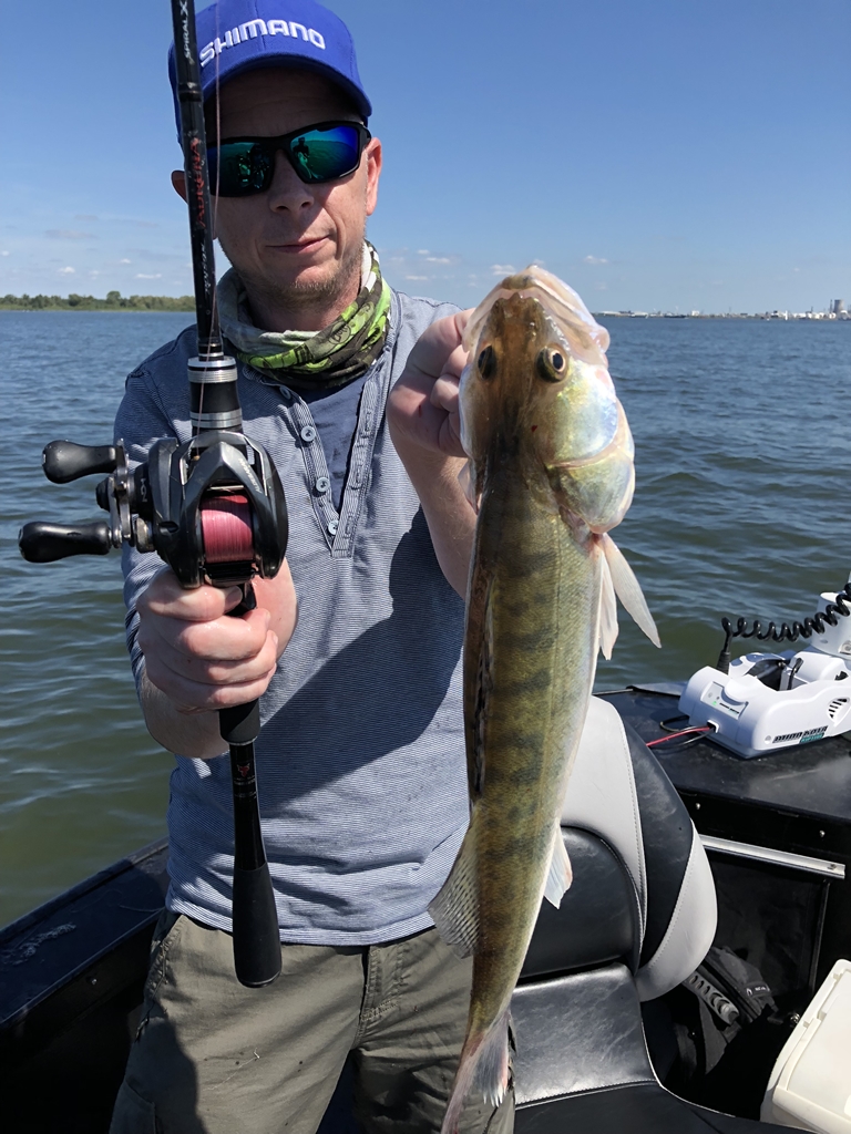 In de middag als het rustiger wordt gaan we naar een mooie plek om de rest van de dag te gaan werpen. Van tevoren bespreek ik altijd de doelen voor die dag met de gasten. Gerard heeft nog nooit snoekbaars gevangen en wilde er graag eentje vangen. Dat is alvast gelukt. Anton wil leren werpen met een baitcasterreel, hier hebben we mooi even tijd voor nu. Eerst maar even de basisprincipes uitleggen en oefenen. Als hij een paar worpjes gemaakt heeft gaan we naar de stek waar het moet gebeuren. De wind is niet ideaal om werpend te vissen, want deze komt van de zijkant.