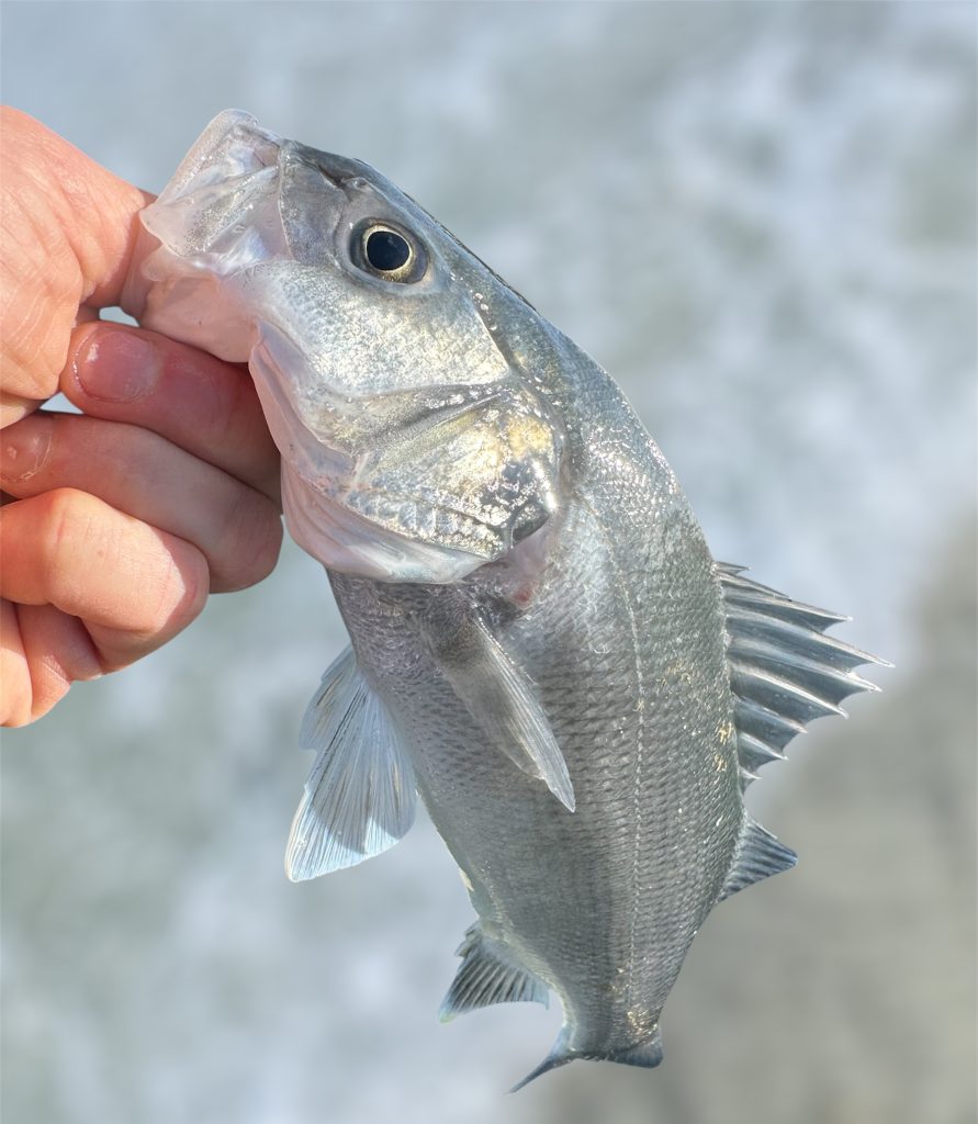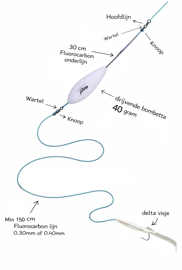 We nemen een bombetta, een drijvende van 40 gram, een leader van 30 cm, wartels van 30 kg trekkracht, een fluorocarbon onderlijn van zo’n 30/00 á 40/00 en een zogenaamde Delta shad. Dit is een soort shadje die lijkt op een zandaaltje, een favorietje van de zeebaars