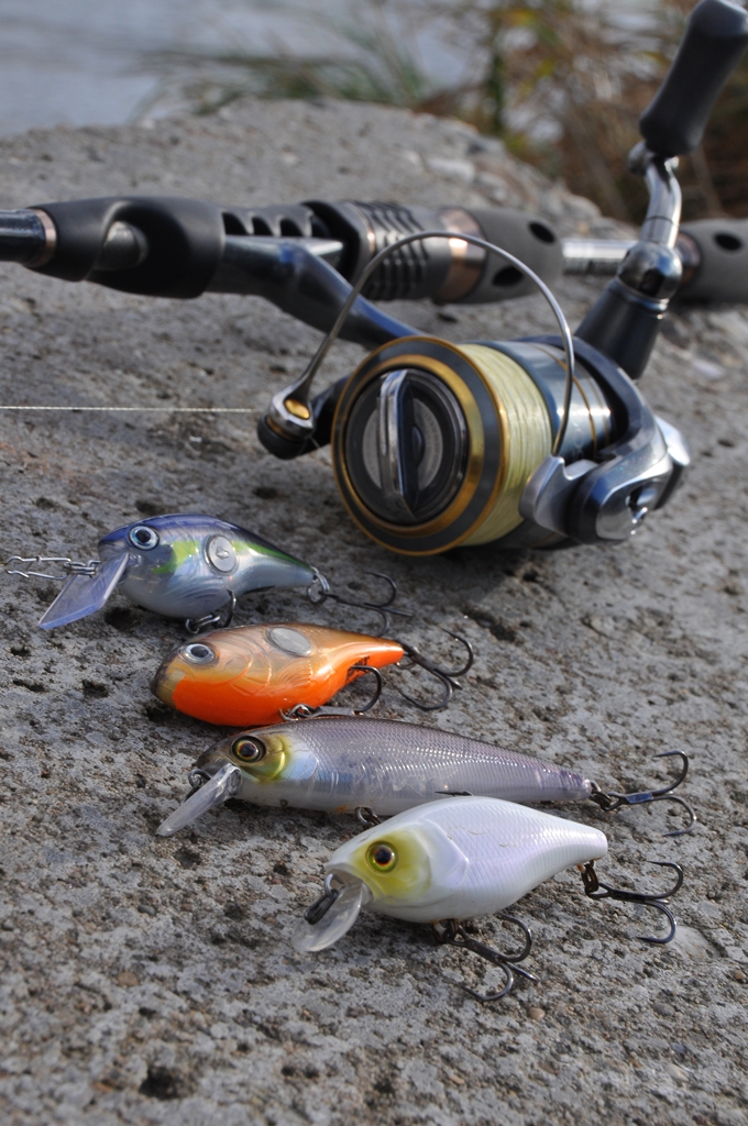 De succesformule. Twitchbaits en plugjes met ratel. Tweede van onder is de Squad Minnow van Illex, ideaal voor dit werk.
