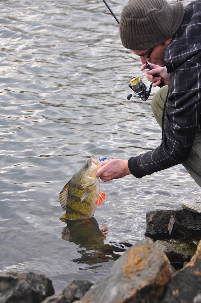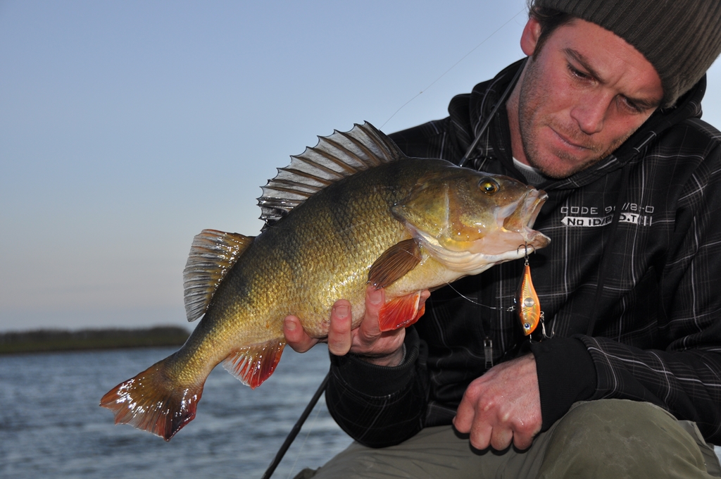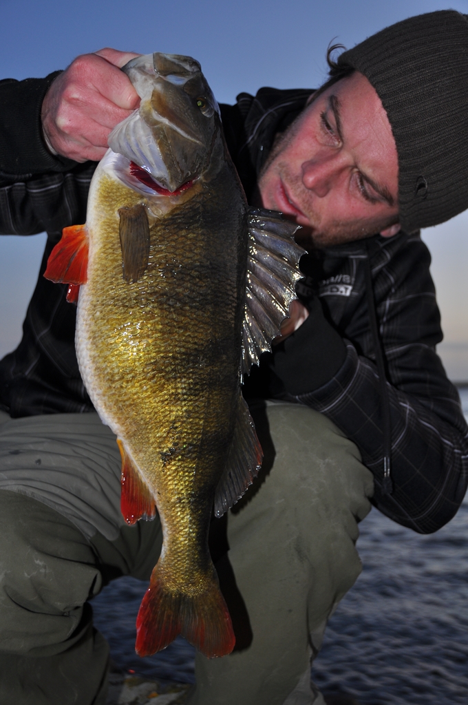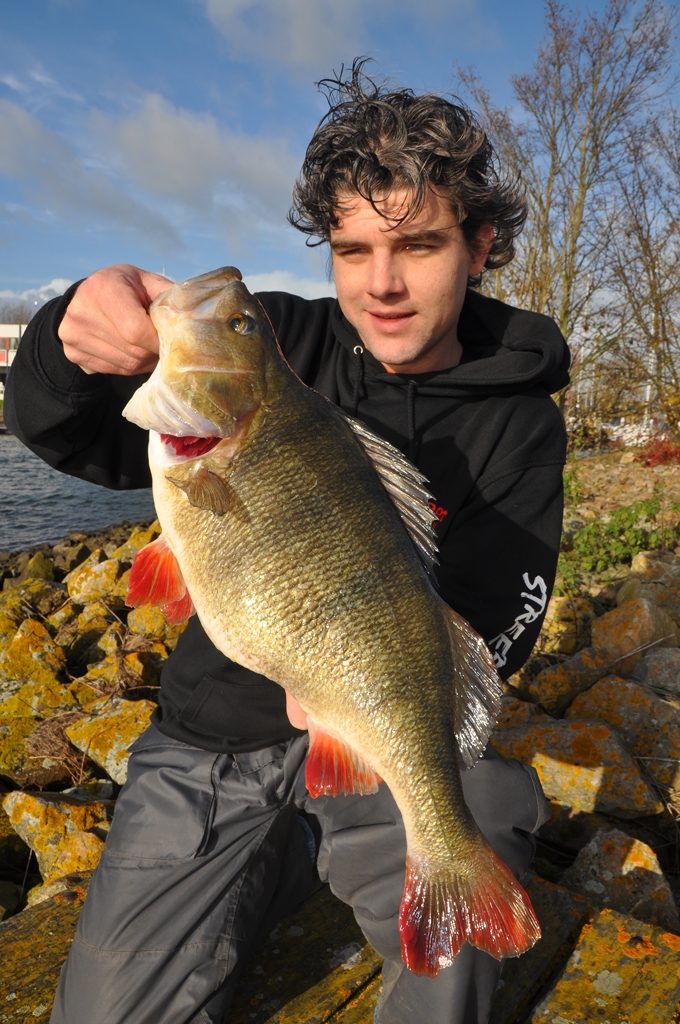 De eerste worp is het al hangen. Een lomp lijf stort zich tijdens het stilhangen met al zijn gewicht op het kunstaas. De hengel kreunt van genot. Het kenmerkende beuken. Yeah! Wat is dit toch altijd weer waanzinnig en dan heb ik de vis nog niet eens gezien. Het is kraakhelder water en al op twee meter diepte zie ik een diepgeel gekleurde rover met knalrode vinnen. Ahhhh…