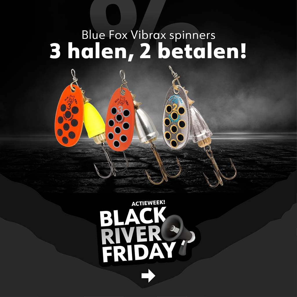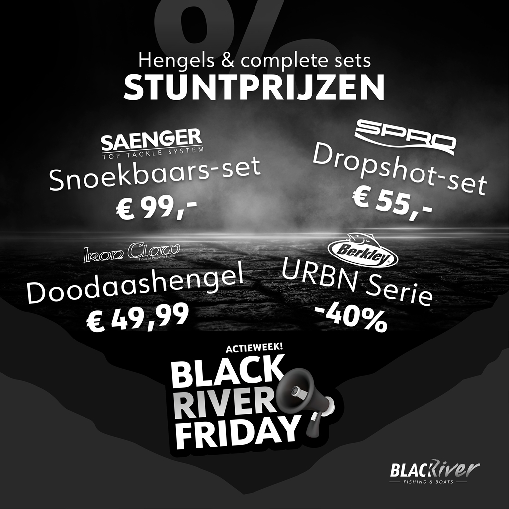 Nogmaals, alle aanbiedingen in dit artikel zijn uitsluitend geldig bij een bezoek aan de fysieke winkel. Adres: Black River Fishing & Boats; Industrieweg 38; Hasselt. Voor alle aanbiedingen geldt het principe op=op / zolang de voorraad strekt. Op maandag 20 november is Black River Fishing geopend van 13.00-18.00 u. Van dinsdag t/m vrijdag van 10.00-18.00 uur en op zaterdag van 09.00-17.00 uur. Van harte welkom Bij Black River (Friday)!