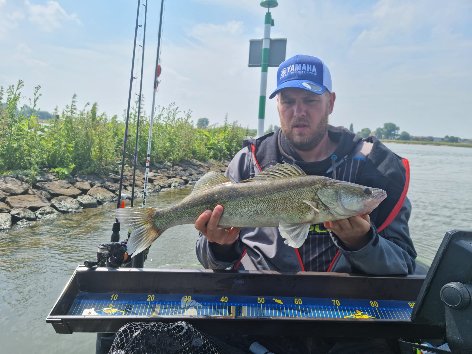 08:47 Team Warren© Breur met een snoekbaars van 76 cm! Deze mannen gaan wel erg goed met nog een snoekbaars van 75 cm. Nog geen uurtje vissen en dan al 1,5 meter aan zander kunnen aanbieden. Allememachies!