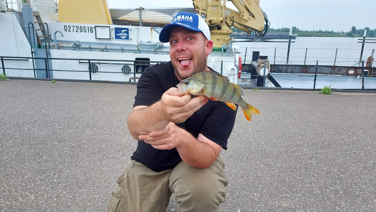 09:04 Team Van der Kooi© Soepboer met hun eerste vangst! 🙂 Baars van 33 cm.