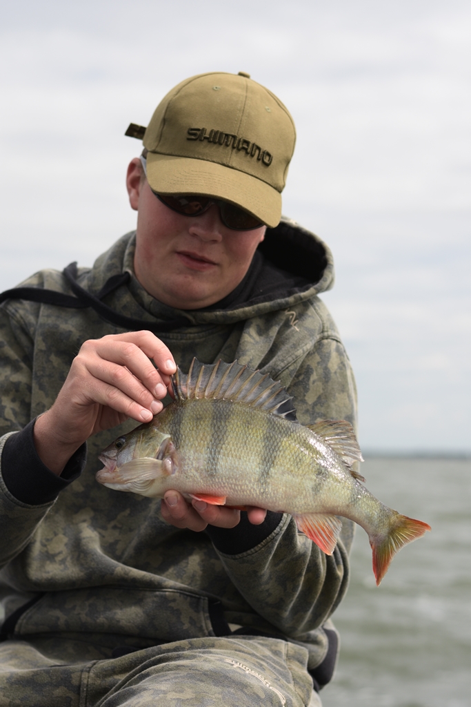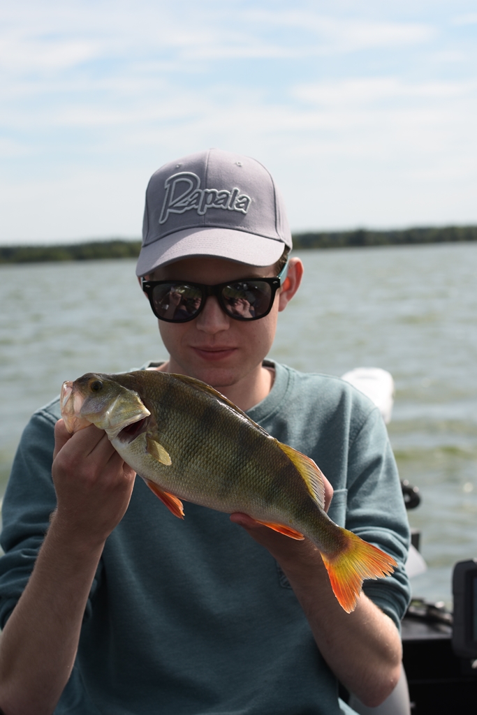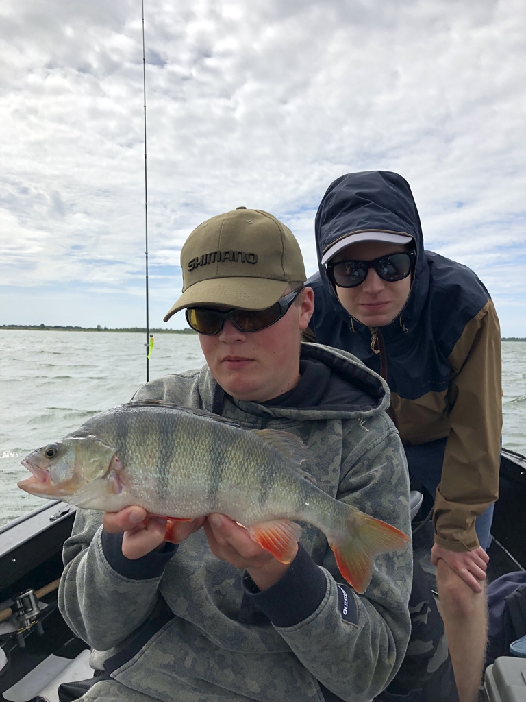 Iwan komt met het idee om te gaan trollen en snel pakken we de geschikte hengels hiervoor en knopen er allemaal een ander plugje aan. Nico en Iwan vissen met een lange hengel aan de buitenkant en ikzelf met een korte in de midden. Het is niet onze favoriete manier van vissen, maar wel effectief om snel veel water af te vissen. Daarnaast leer je, als je de dieptemeter in de gaten houdt, snel hoe het bodem verloop is. We trollen een paar uurtjes heen en weer en vangen een paar baarsjes. Niets groots.
