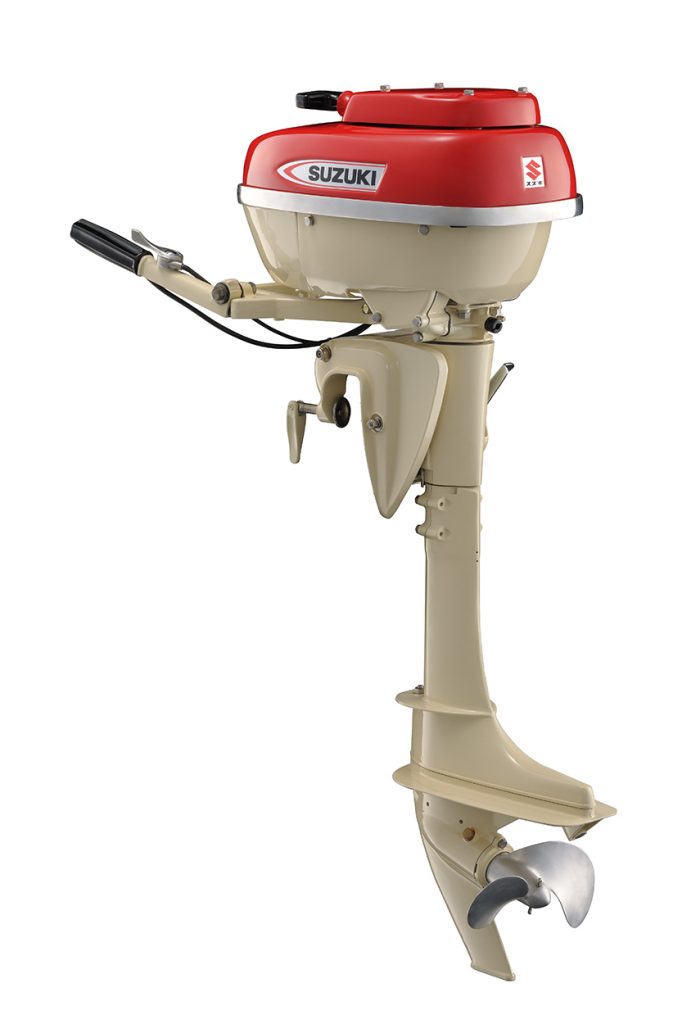 De D55, Suzuki’s eerste buitenboordmotor uit 1965, is te zien naast het huidige vlaggenschip, de DF350A.