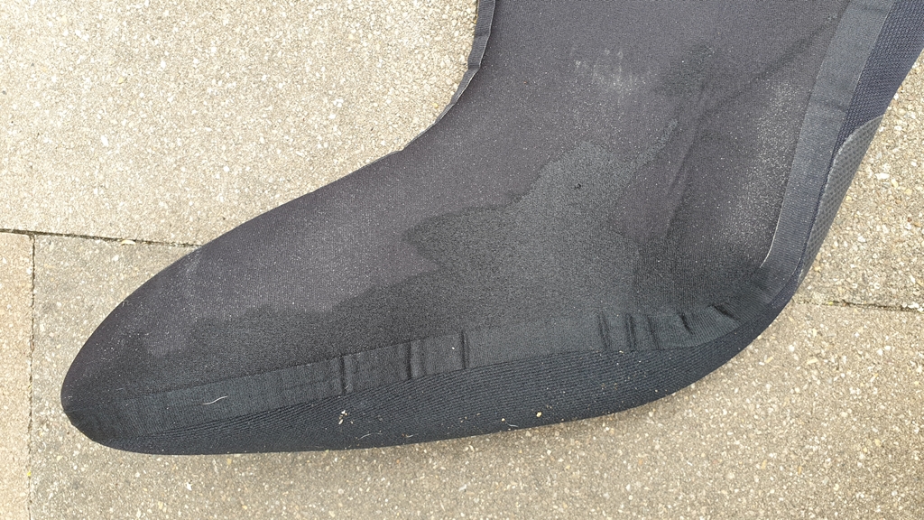 Hierna is het wachten totdat het waadpak goed droog is en kan er geplakt worden met de Aquasure. Ik had een gaatje op de neopreen sok die aan het waadpak vast zat en heb ervoor gekozen om de Aquasure aan de buitenkant van het waadpak te plakken. Er is wel een lijmplekje te zien, maar deze valt weg in de schoen. Enige nadeel van de Aquasure is de tubes waarin het geleverd wordt, dit zijn vrij grote tubes van 28 gram en kosten circa €10,-. Voor het plakken van een gaatje in het waadpak heb je maar heel weinig lijm nodig en zo blijft er een hoop over.