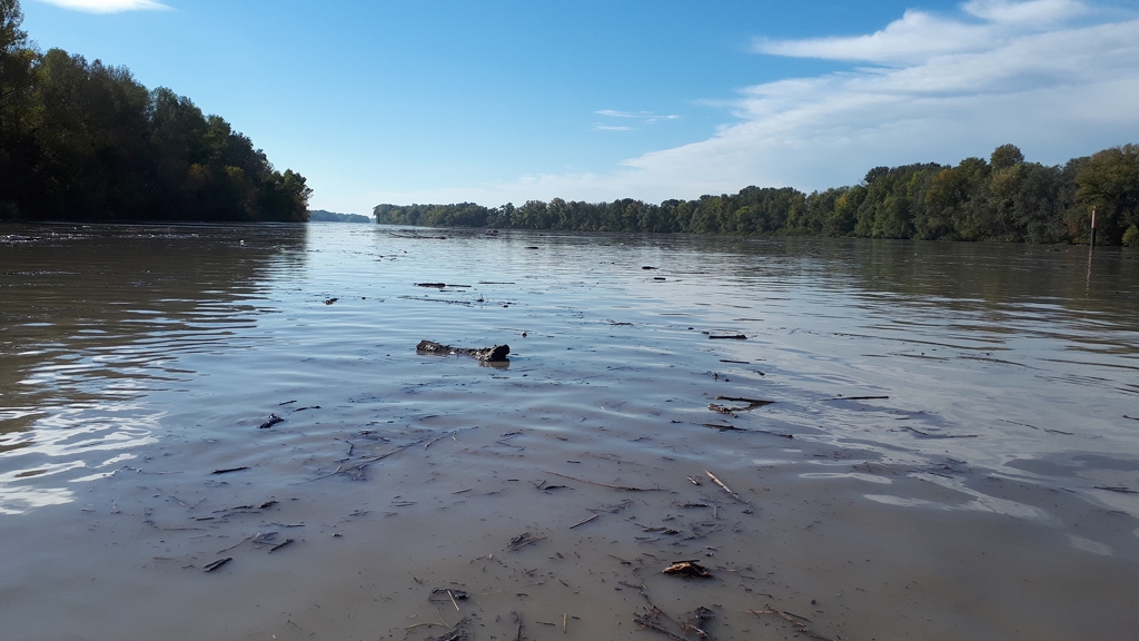 Ik merk op dat het water snel bruin wordt. Ik weet dat dit wel vaker de voorbode van hoogwater is. De zondvloed die zich de volgende uren aankondigde had ik eerlijk gezegd onderschat. Het peil stijgt net geen drie meter nog voor het middag is. Het debiet is de 5000m³/sec ruim gepasseerd. Verkassen is bijgevolg enkel nog in afwaartse richting mogelijk. Mijn 15pK benzinemotor redt het tot 3500m³/sec…
