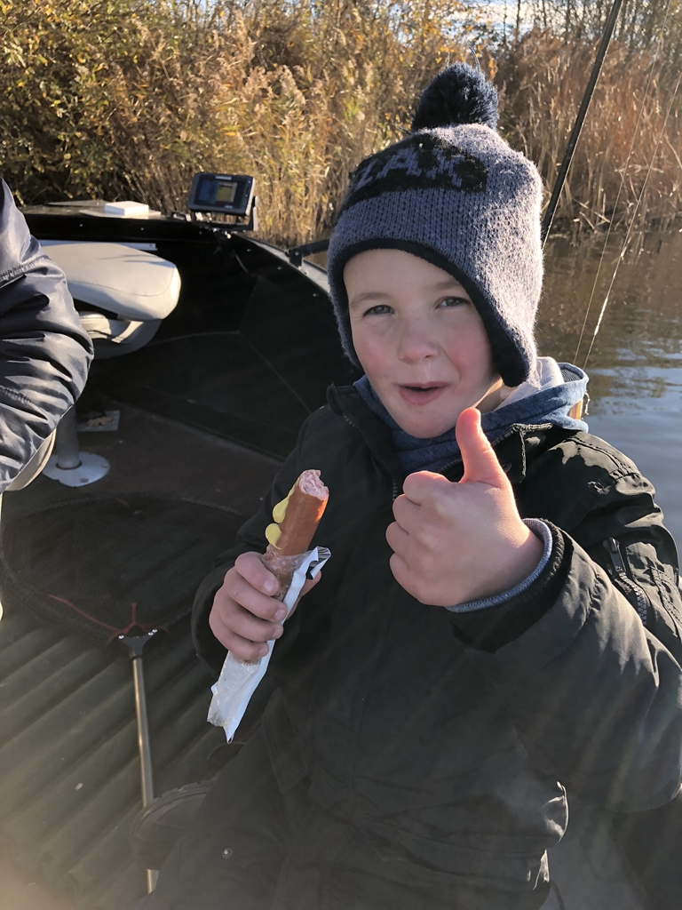 Tussen de middag leg ik de boot even aan op een plekje uit de wind en in de zon om even te pauzeren. Ik heb lekkere warme worst meegenomen, dat gaat er met deze kou wel lekker in. De middag verloopt wisselend: zo vang je een tijdje niks en dan weer een paar achter elkaar.