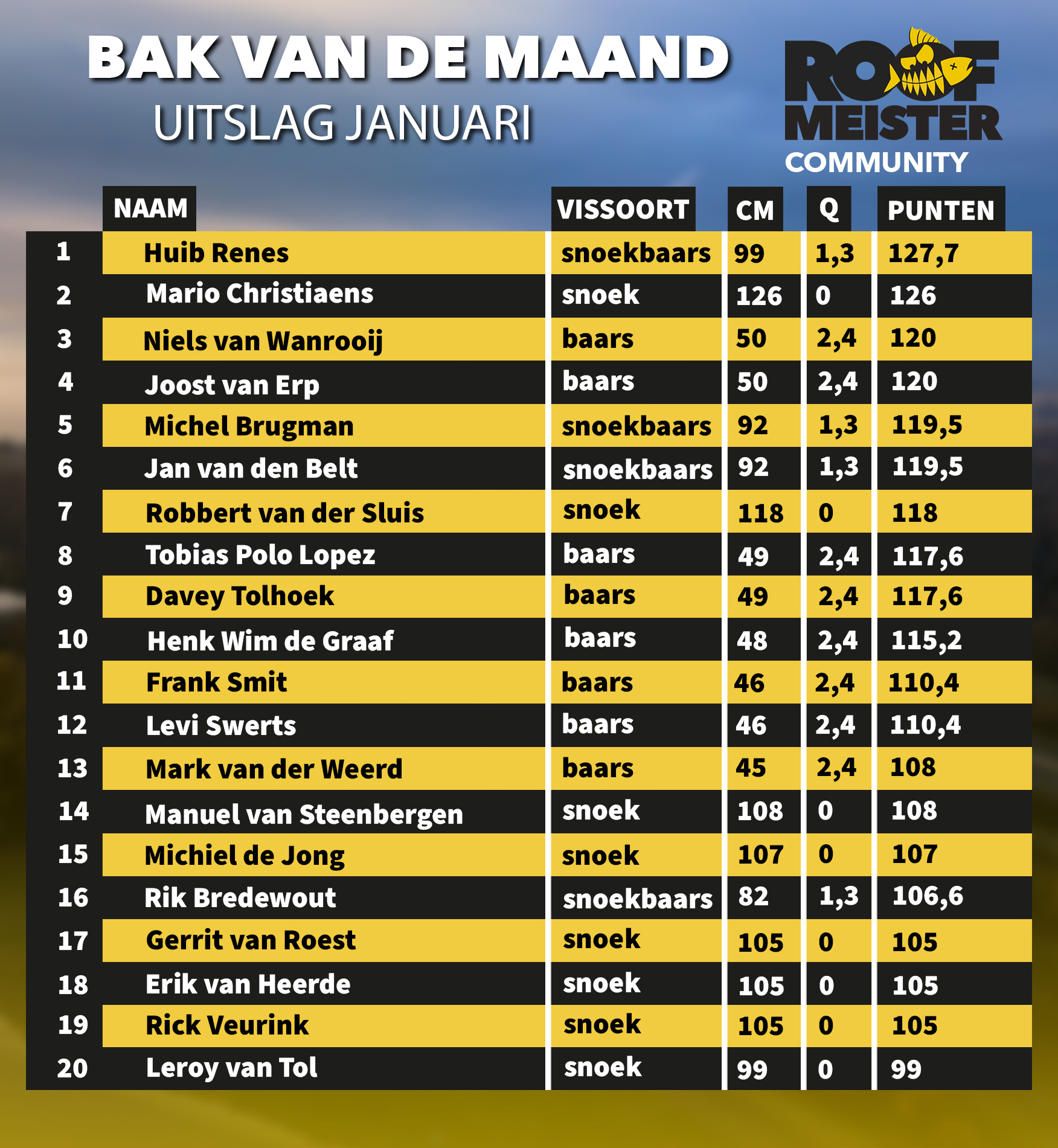 Jaja mensen, een bloedstollende maand was het. Alles leek erop dat de Maandelijkse Bak gewonnen zou worden door Mario Christiaens met een geweldige snoek van 126 cm. Totdat Huib Renes de moeder der snoekbaarzen van 99 cm op de laatste dag instuurde! Wat een maand, dat is hoe je een jaar wilt starten!