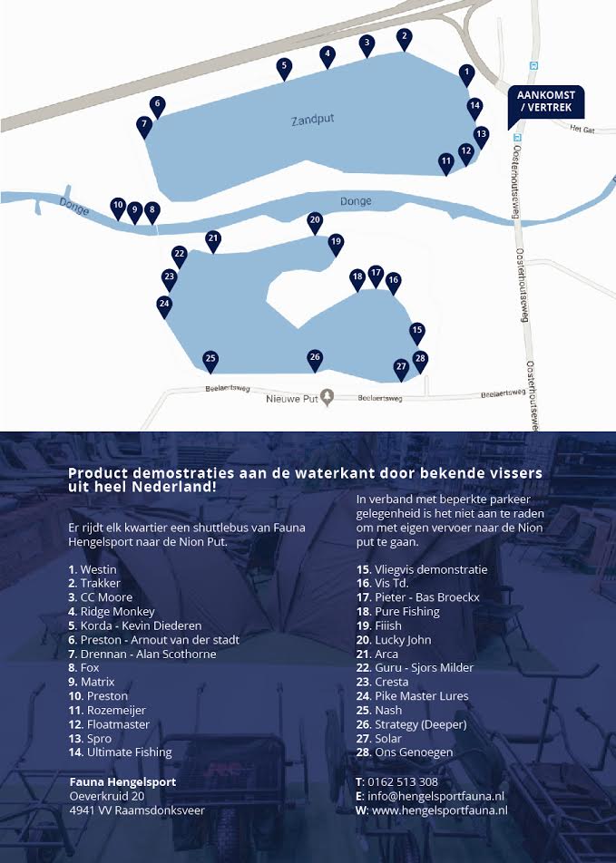 Bovenstaand de plattegrond van de product demonstraties aan het water. Er rijdt ieder kwartier een shuttlebus van Fauna naar het water (de Nion put in Raamsdonksveer).
