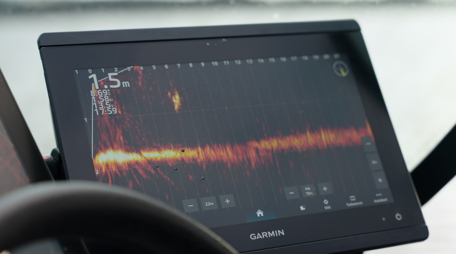 Het klinkt misschien wat overdreven, maar dit is toch echt de situatieschets die wij van Jyri en Toni voorgeschoteld krijgen en… Niks minder zou blijken tijdens het vissen zelf. De Garmin LiveScope zou onze beste vriend worden. Ja, er is een hoop discussie over het hele live sonar gebeuren, maar zonder zou niemand hebben geweten van deze regelrechte recordvissen op dat water. Nou ja, niet helemaal, dat zou dan voorbestemd zijn gebleven aan diegenen die met een 2D sonar pelagisch uit de voeten konden; een select groepje, waartoe ook Toni behoorde.