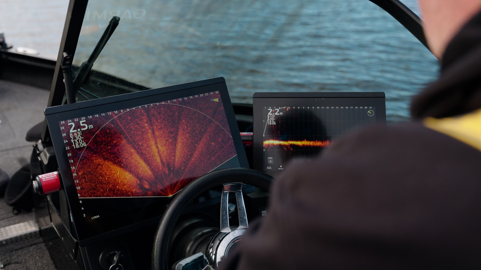 Links de Garmin PS30 met Perspective mode waarmee in een groot spectrum signalen werden gescand, rechts de LiveScope voor het lasergestuurde werpwerk.
