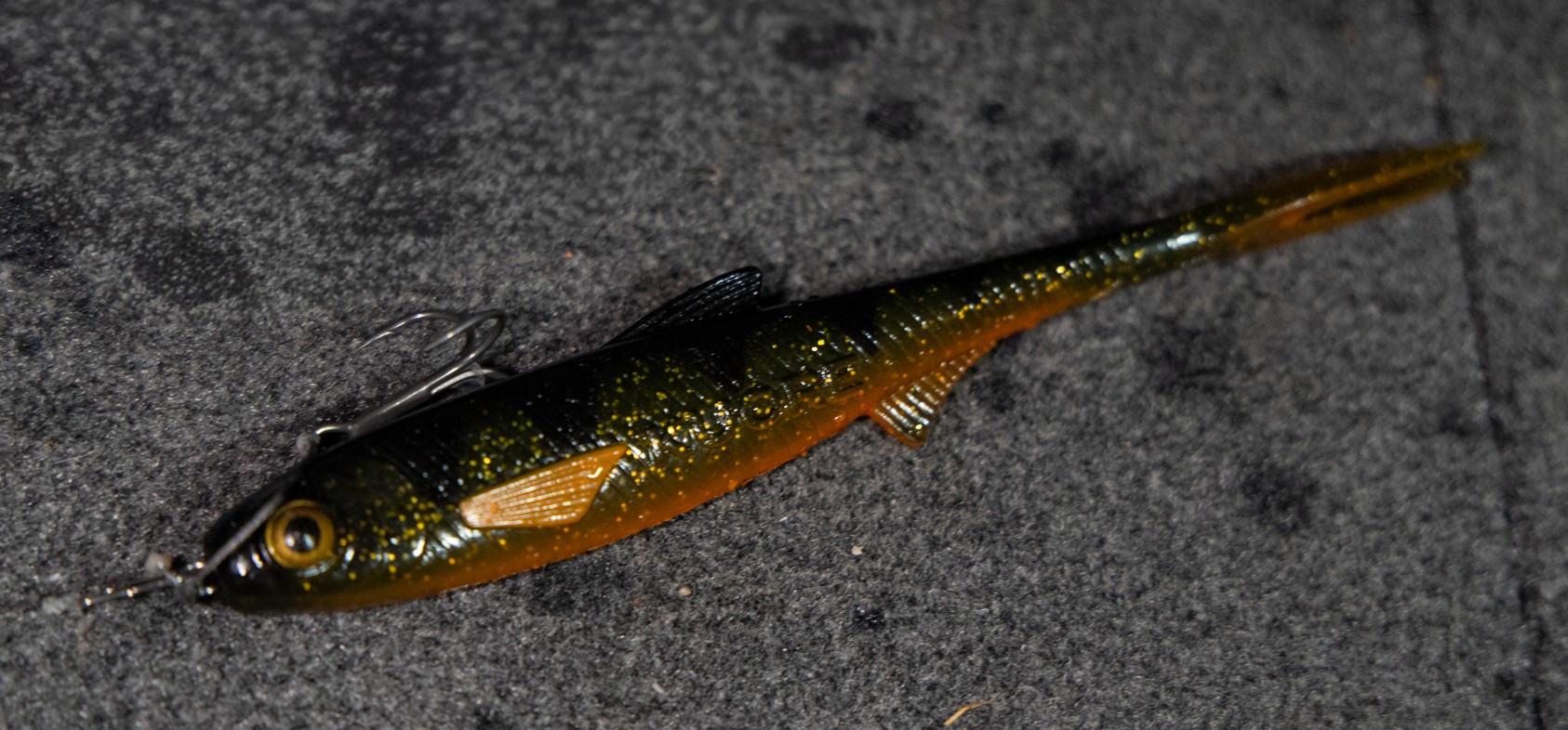 Uiteraard was het daarbij belangrijk om het kunstaas zo natuurlijk mogelijk aan te bieden en mede vanwege de beperkte diepte werd daarom gekozen voor een onverzwaarde Kuore Phantom shad, kunstaas dat van kop tot staart ontwikkeld is voor deze visserij, inclusief een ingenieuze, interne luchtkamer voor een zo optimaal mogelijke (horizontale) presentatie en voor (niet geheel onbelangrijk) nog betere zichtbaarheid op het display van de fishfinder. Links- of rechtsom, deze shad zonk tergend langzaam af op slechts het gewicht van de dreg.