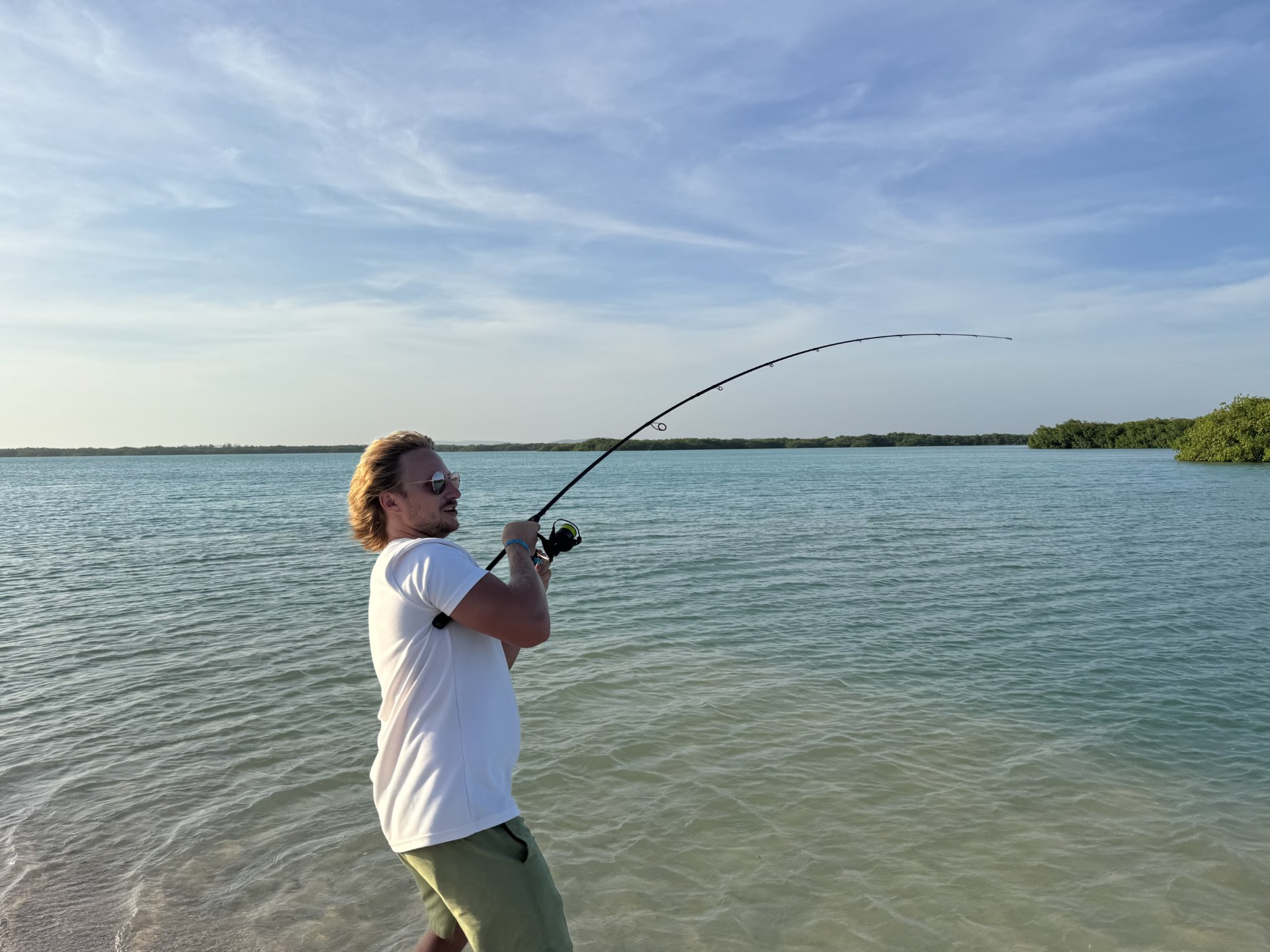 Wadend op een rif, midden in de branding, mikkend op grote barracuda of tarpon.