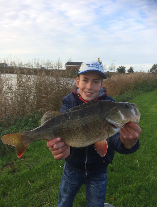 Hij stuurde ons ook deze foto van een baars van 52 cm. En zijn lijst met pr’s. Houd je vast… Snoek 112 cm, snoekbaars 88 cm, baars 52 cm en roofblei 72 cm. Zo jong en dan al zo’n indrukwekkende lijst. Pfff, de jeugd van tegenwoordig 😉