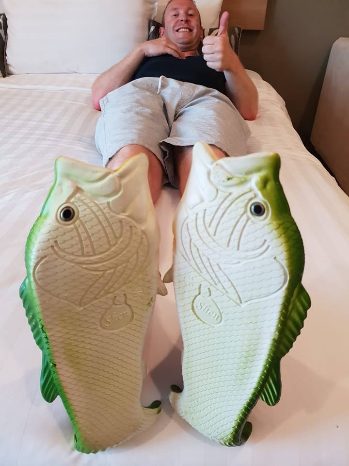 De nieuwe brandmanager Thijs van der Sanden van Rozemeijer met zijn gloednieuwe sloffen.