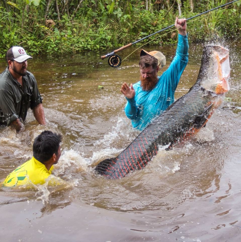 Geen idee wat er precies gebeurt, maar je kunt zo een goede 10 minuten naar deze foto kijken en je dat afvragen. Dit formaat arapaima met een vlieghengel roept sowieso de nodige vragen op…