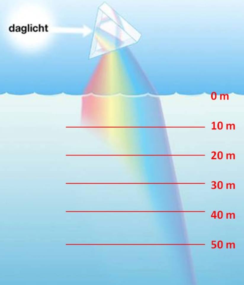 Diana Boekhoff poste nav deze discussie deze interessante afbeelding, waarop je kunt zien hoe kleur onder water verdwijnt des te dieper het wordt . Overigens heeft de helderheid van water daar ook alles mee te maken. Op troebel water gaat dat proces veel sneller dan op helder water.