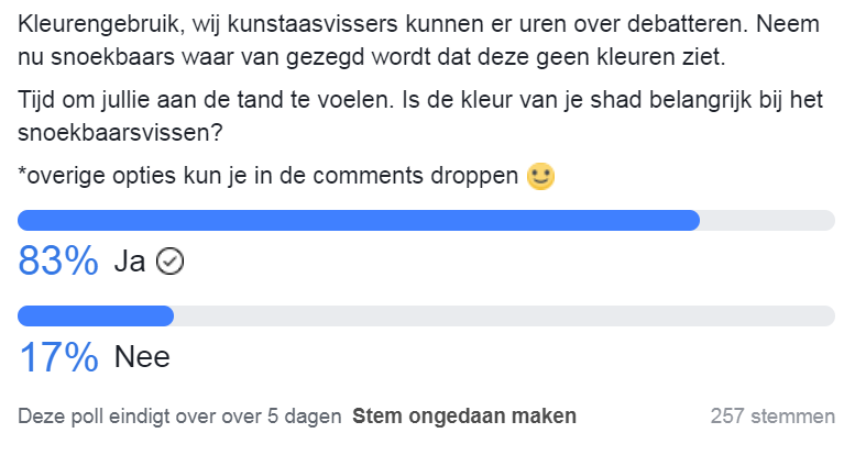 Van snoekbaars wordt gezegd dat deze geen kleuren kan zien, maar elke kleur heeft ook zo haar tinten, dus betekent dat dat het verschil in tinten kan uitmaken. Hoe dan ook een lastig vraagstuk. Wel kunnen we hier uit opmaken dat kleur wel degelijk uit kan maken. Tenminste als we de meerheid mogen geloven hierboven die dat totetst op basis van zijn eigen ervaringen…