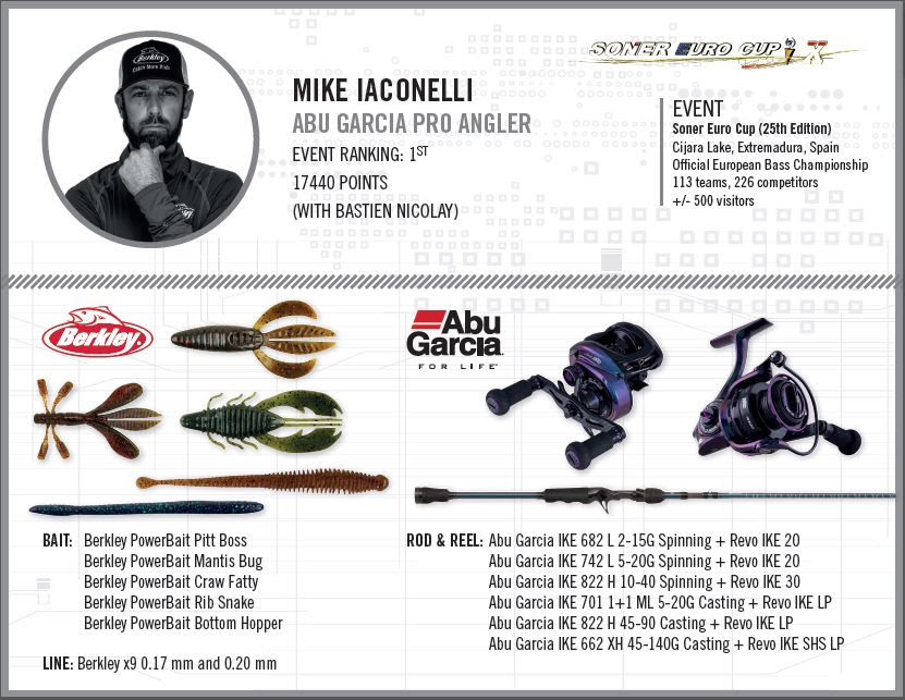 Dat niet alleen, op het stuwmeer Cijara in Spanje heeft grootheid Mike Iaconelli meegedaan aan het grootste basstoernooi van Europa, de Soner Euro Cup (226 deelnemers!), uiteraard een optimale gelegenheid om de IKE reels en hengels te presenteren. Materiaal met alles in zich wat een ware pro angler van zijn masteriaal eist.