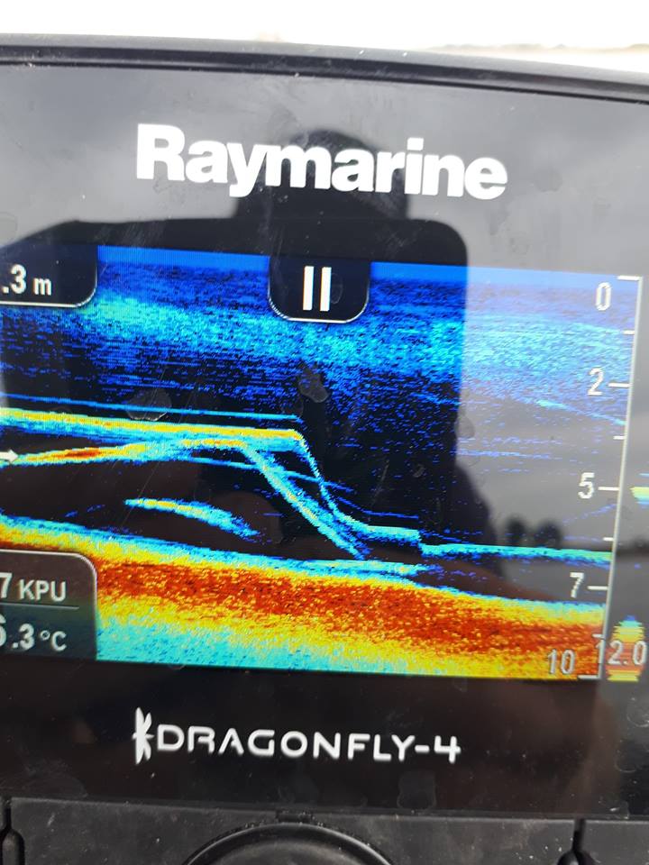 Gelukkig keert mijn focus terug als ik dichter bij de stek kom. De bodem begint langzaam af te lopen en mijn teaser volgt het bodemverloop op zo’n 3 meter erboven. Dan… een vaag streepje onder mijn aas… ‘Focus Ronnie, focus!’ Het streepje wordt dikker, wordt een streep. De kleur verandert van blauw naar helder rood… Trillend zit ik klaar. Het signaal wordt dikker en roder. Daar komt ie omhoog… BAM! Hangen! Yeah!!!