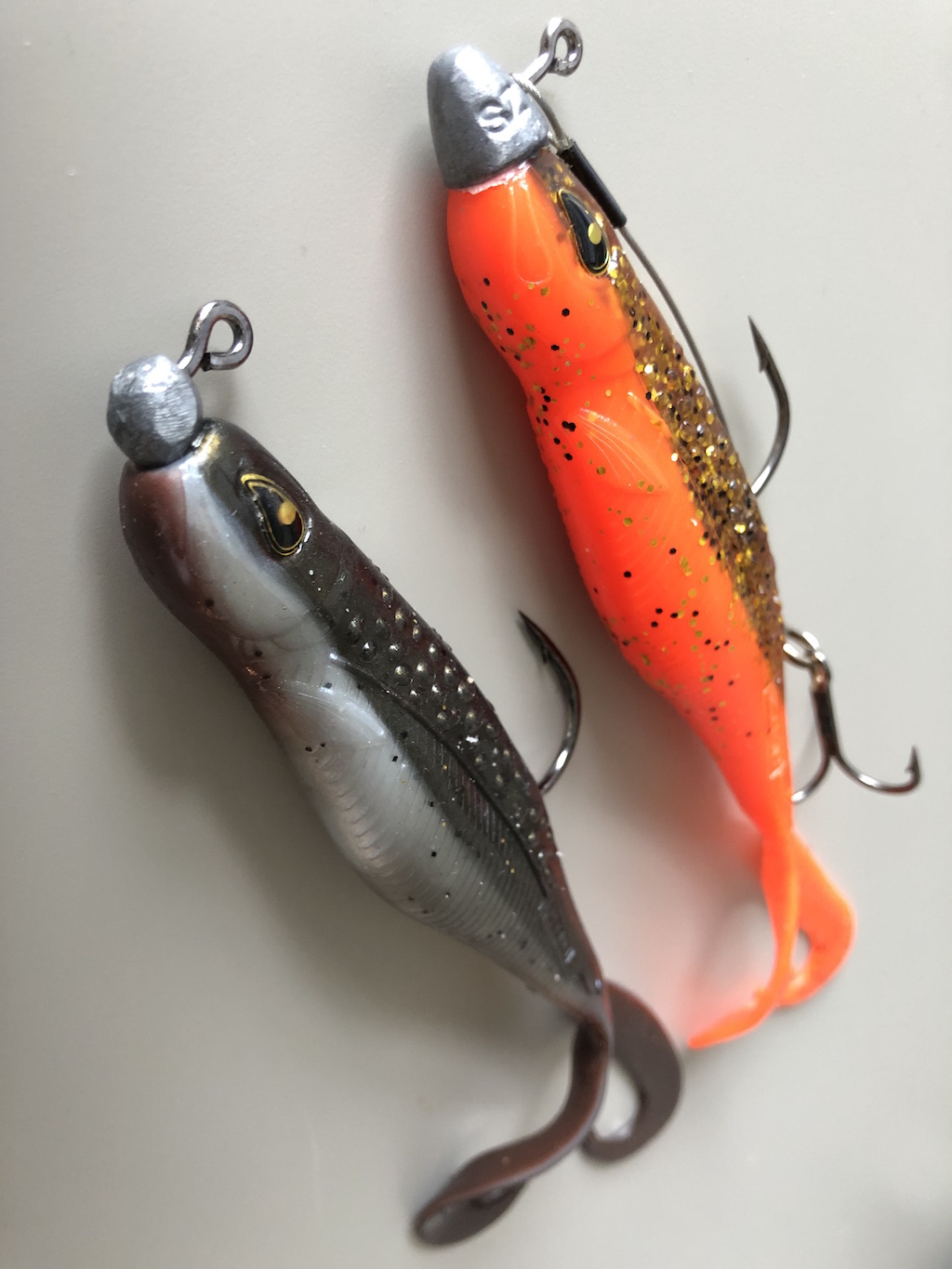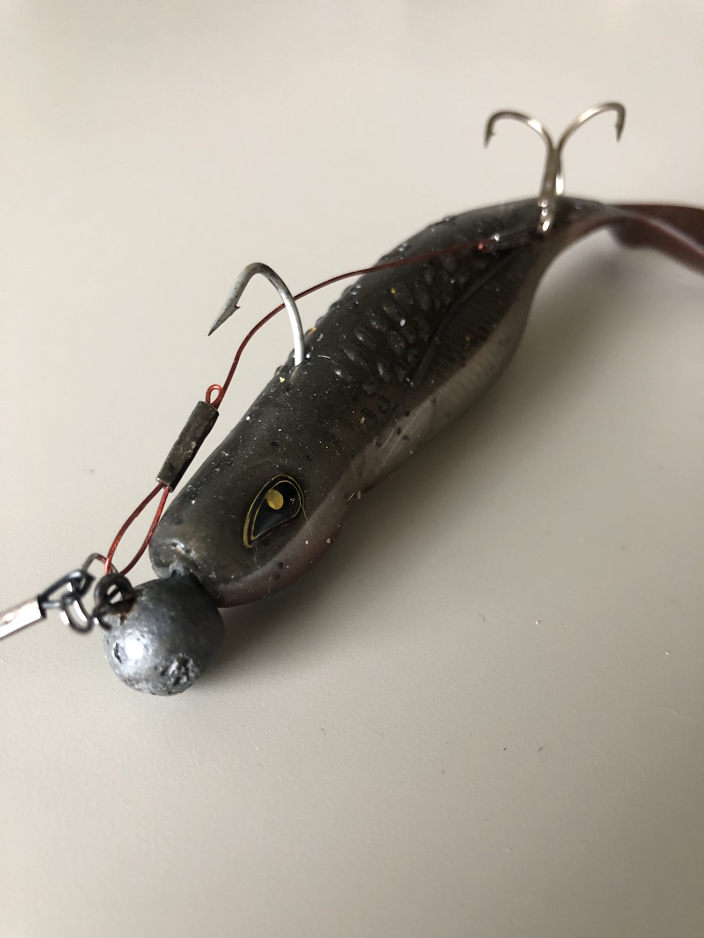 De keuze voor de montage was snel gemaakt. Ondanks zijn lengte, is een deel niet bruikbaar om je montage in te haken vanwege de twisterstaart. Daarom heb ik hier gekozen voor een enkele 5 grams loodkop met een 8/0 haak. Op de andere shad monteerde ik een 10 grams loodkop met een 6/0 haak en een stinger.