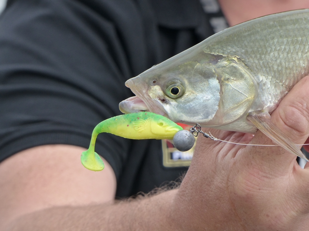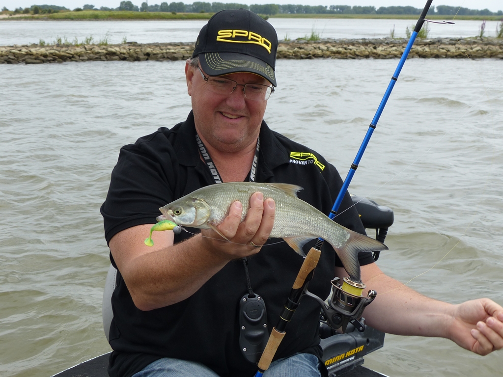 Daar kom je alleen maar achter door erop te werpen. En dat doen we dan ook. Ik heb een klein shadje, een Fast Eddy, met een middelzware loodkop in gebruik en wacht niet af. De worp midden in de harde stroom, wordt direct beantwoord door een keiharde aanbeet. Hangen!