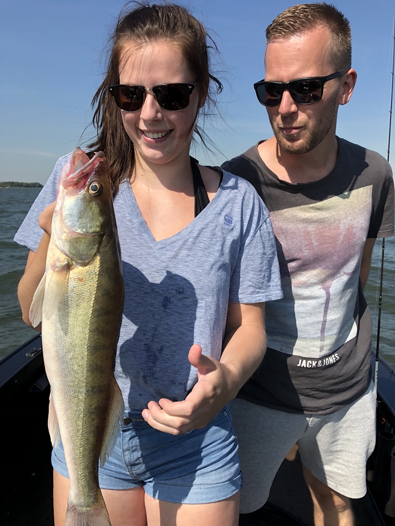 We gaan vlak bij de trailerhelling nog een laatste drift maken. Als we net alles er weer in hebben liggen roept Maroes: “Ik heb er geloof ik één, of ik zit vast.” Het begint te zwemmen, het is een vis. De hengel waar zij mee vist staat als een hoepel als de vis onder de boot door duikt. Hij pakt de lijn van Jelmer mee, het wordt even hectisch want de lijn dreigt in de boegmotor te gaan. Met z’n drieën slagen we er in alles onder controle te krijgen en vervolgens kunnen we een mooie glasoog scheppen. Wat een dag, heel veel vis verspeeld maar een paar mooie vissen gevangen. Het was zeer zwaar vissen met de harde wind. De gasten waren weer top en ik zag ze genieten, ook toen we door de golven knalden terug naar de haven. Het was weer een mooie. Oant sjen