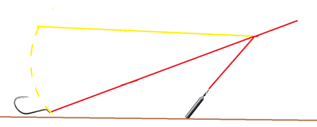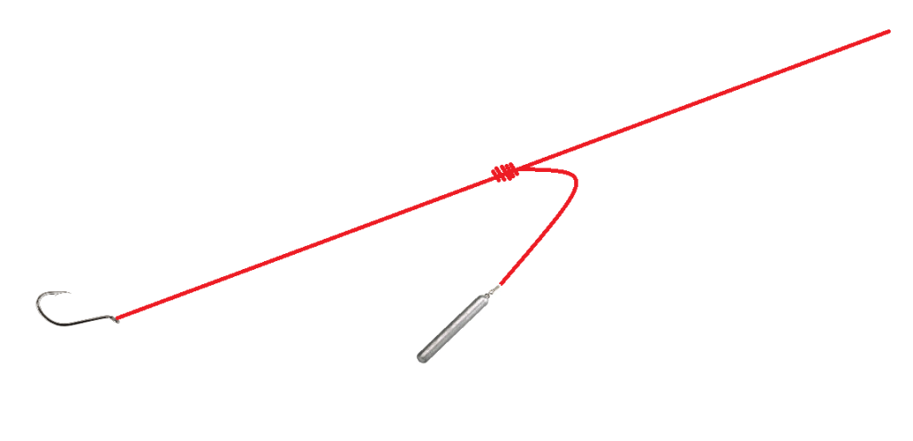 Let op, het is erg belangrijk dat de lijn niet richting je haak wijst, anders wordt de hoofdlijn niet afgehouden van je gewichtje tijdens het werpen en raakt je rig in de knoop. Check HIER een video over het knopen van deze rig.
