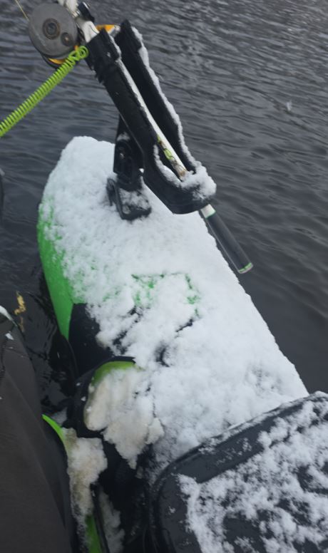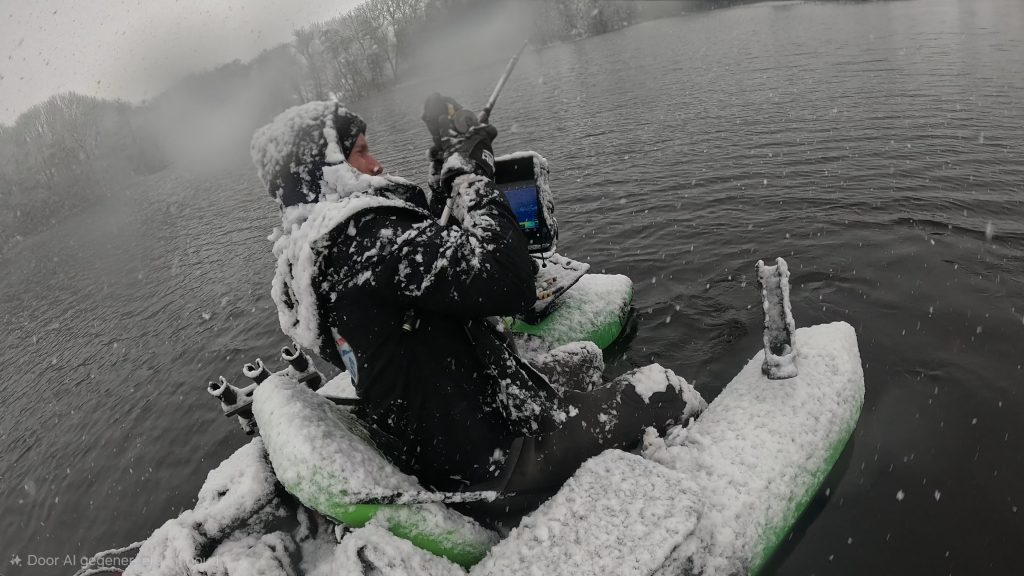 De wegen zijn slecht begaanbaar. Sneeuw, ijs en nauwelijks verkeer. Elke rotonde en elk kruispunt vraagt concentratie. Wat normaal een korte rit is, wordt een tocht van anderhalf uur. Vijfenveertig minuten vertraging, maar omkeren is geen optie. Niet vandaag. Eenmaal aangekomen is de wereld wit en stil. Geen boten, geen mensen, alleen water en sneeuw. De bellyboat gaat te water en al snel begint het opnieuw te sneeuwen. Zachte vlokken die alles bedekken: mijn schouders, mijn handen, mijn hengel. Zelfs de bellyboat verandert langzaam in een witte vlek op het donkere winterwater.